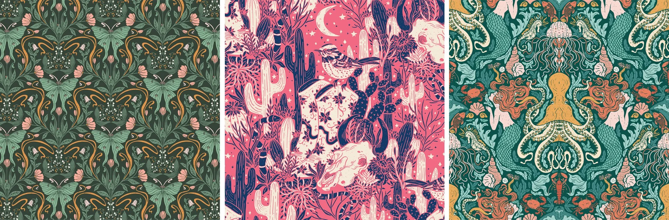 I don't know if there was a specific pinpoint moment that made me realize that this was what I wanted to do... I think it was always inside me - just in the form of, "Wouldn't it be cool if, in a perfect world, I could be an artist as my JOB?!" I have always loved art - I love looking at it, I love creating it... I live and breathe it! I do think, for surface pattern design, I did have a moment when I thought this was something I really wanted to pursue fully. That moment was during Bonnie Christine's Immersion course when I took it the second time through. I created the very first pattern that I ever really felt proud of, and Bonnie actually called it out as one of the best hero patterns during a live call. That moment of getting positive outside feedback from someone else's eyeballs was instrumental to me. I thought, maybe I actually have something here that people could want...