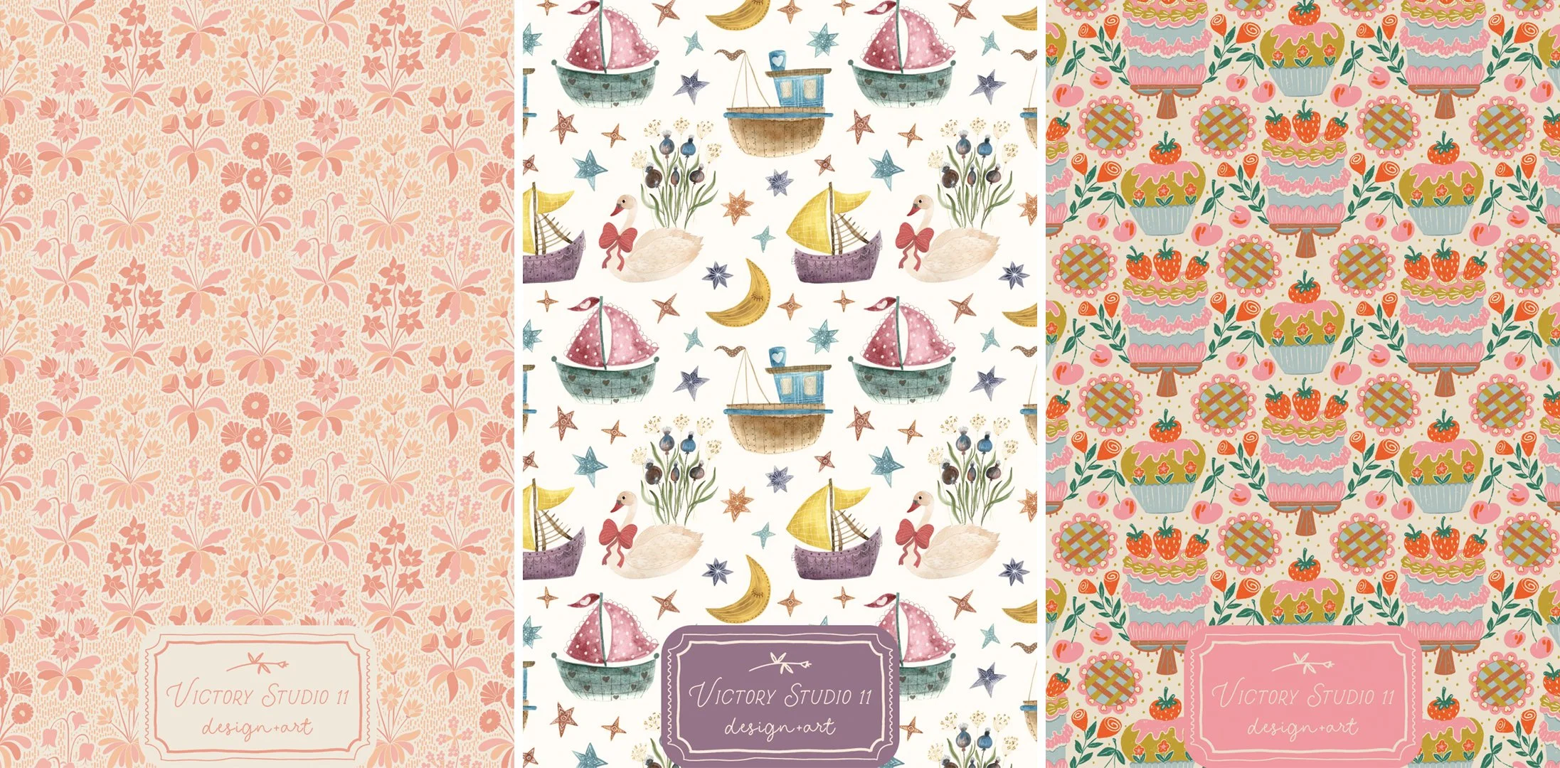 designers. Since childhood, I've loved beautifying my surroundings, and it brings me immense joy when others find the world more beautiful through my works. My business, Victory Studio 11, specializes in high-quality surface pattern design and mockup creation. I design eye-catching patterns for fabric, home decor, and wallpaper for both kids and adults, often featuring watercolor florals, cats, birds, and flowers. Traditional historical patterns hold a special place in my creative work. Additionally, I create practical and lovely mockup templates to assist other designers in showcasing their work.